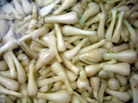 - Vớt kiệu ra, cắt phần rễ và đuôi. Lưu ý: không cắt phần đầu phạm vào trong nếu không kiệu sẽ ngấm nước mà mất đi độ giòn ngon của kiệu. Đem ngâm kiệu vào nước muối. Có thể ngâm kiệu vào nước đá sẽ giòn hơn.