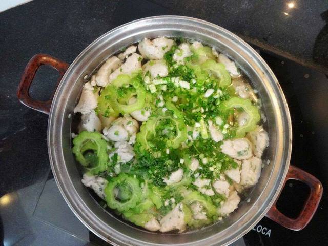 Khi canh sôi bạn nêm gia vị cho vừa miệng rồi cho khổ qua vào. Khi canh sôi trở lại, bạn cho hành lá vào, khuấy đều lên và tắt bếp.