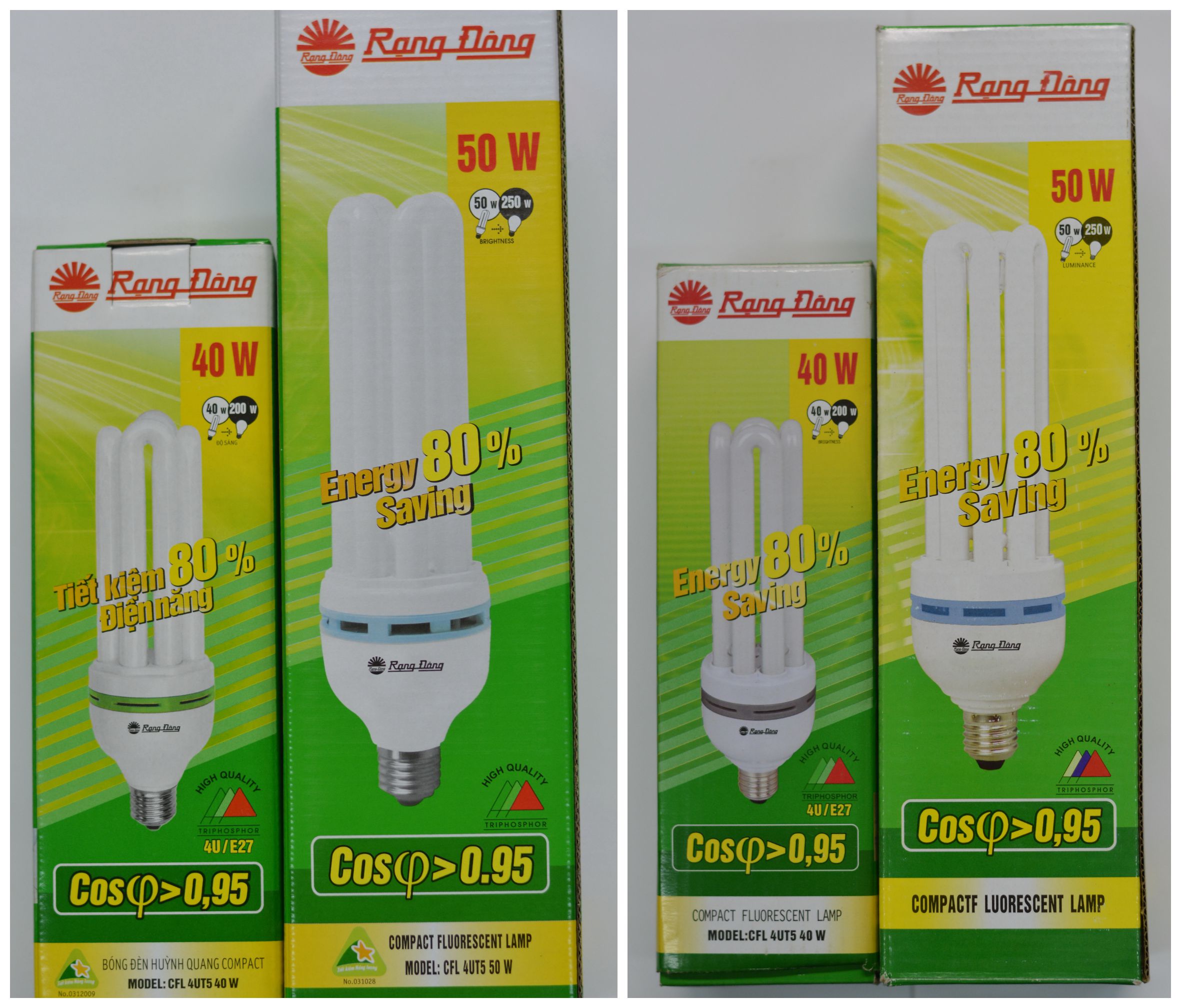 Màu sắc trên vỏ hộp Rạng Đông 40W, 50W chính hãng đặc trưng bởi màu xanh lá cây và màu đỏ, rõ ràng, sắc nét. Có in biểu tượng ngôi sao năng lượng ở bên trái, phía dưới của hộp (ảnh bên trái) |