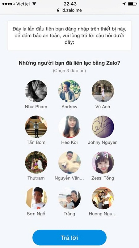 Nếu là lần đầu tiên truy cập, bạn phải trả lời câu hỏi bảo mật. Đó là đánh dấu ba người gần đây nhất mà bạn đã chat Zalo với họ.
