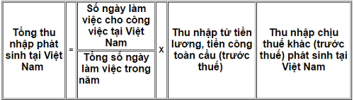 - Việc xác định thu nhập chịu thuế TNCN từ tiền lương, tiền công tại Việt Nam trong trường hợp cá nhân không cư trú làm việc đồng thời ở Việt Nam và nước ngoài nhưng không tách riêng được phần thu nhập phát sinh tại Việt Nam thực hiện theo công thức sau: