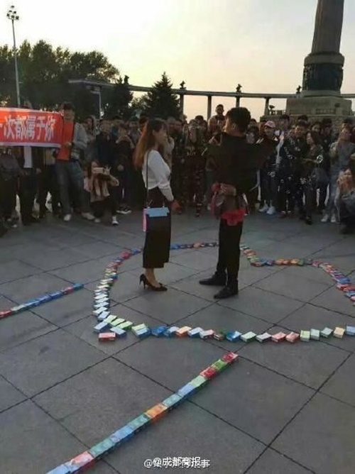 Trước đấy, cô gái bị “lừa” đi dạo, mua sắm, tham quan. Và rồi đến trước khu vực chuẩn bị, chàng trai đã từ từ nắm tay cô bé đi vào hình trái tim 999 bao cao su, đứng đó và tỏ tình.