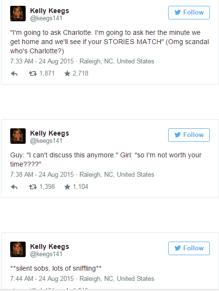 Khoảng cuối tuần qua, một tài khoản Twitter tên là Kelly Keegan đã chứng kiến một "bi kịch" ngay trước mắt mình trong một chuyến bay mà cô đang có mặt: Một cặp đôi cãi vã và đòi chia tay trong lúc chờ máy bay cất cánh. Diễn biến câu chuyện của cặp đôi này có vẻ rất hấp dẫn, nên Keegan đã quyết định "tường thuật trực tiếp" những gì đang xảy ra giữa họ ngay trên Twitter. Dường như máy bay bị trễ rất lâu, vì vậy Keegan đã có thời gian cập nhật gần như là từng câu từng chữ cặp đôi này đang nói với nhau.