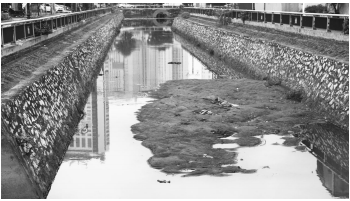 Bùn thải lấp đầy dòng chảy khiến cho nước sông đen ngòm. |