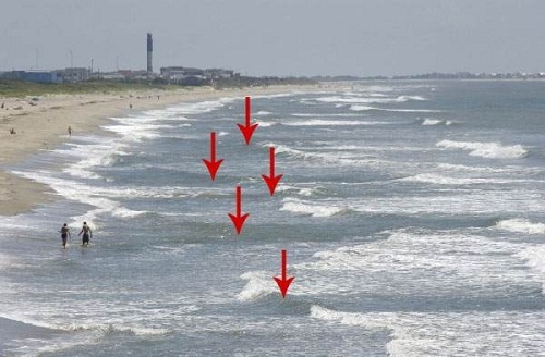 | Nơi có dòng chảy xa bờ thường là vùng phẳng lặng, ít sóng (nơi mũi tên đỏ) (ảnh: safebee) |