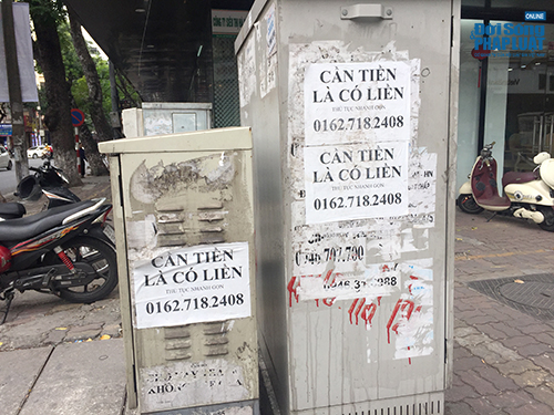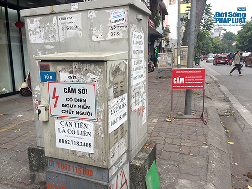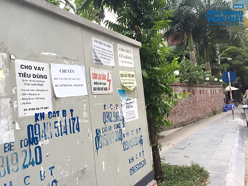 | Những tờ quảng cáo cho vay tiền dán đầy trên các cột điện, trạm biến áp trên phố Trương Công Giai. |