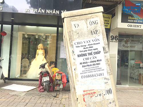 | Không khó để bắt gặp những tờ quảng cáo cho vay tiền dán trong các làng Phú Mỹ, Phú Đô, Nhân Mỹ... nằm trong khu vực Mỹ Đình. Đây là nơi có nhiều khu trọ sinh viên, nhóm đối tượng thường gặp khó khăn về kinh tế. |