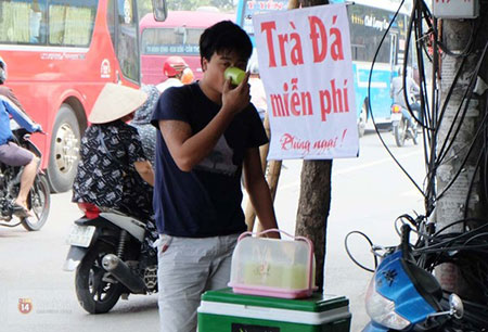 Tấm biển “Trà đá miễn phí” kèm theo lời nhắn nhủ mọi người “Đừng ngại” đã nhận được thiện cảm của nhiều người đi đường. Đây cũng là điểm thường xuyên lui tới và không còn xa lạ với những người lao động nghèo, xe ôm… hay những người đi đường muốn uống cốc nước miễn phí để phần nào xua đi cơn khát dưới cái nóng gay gắt của mùa hè.