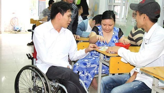 Thầy giáo đi xe lăn tới lớp mỗi ngày giúp đỡ trẻ em bất hạnh. Ảnh: Pháp Luật Việt Nam |