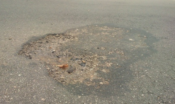 Mặt đường hư hỏng nghi bị tưới hóa chất phá hoại. |