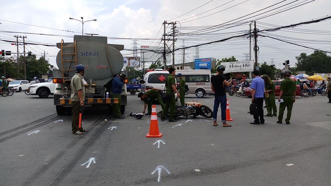 Tại hiện trường, thi thể nạn nhân nằm bên cạnh chiếc xe máy. Xe bồn dừng lại cách đó một đoạn. Vụ tai nạn xảy ra vào giờ tan tầm, lại ngay giữa ngã tư khiến giao thông qua khu vực ùn ứ hàng km. Nhận tin báo, lực lượng chức năng TX.Thuận An có mặt để điều tiết giao thông.