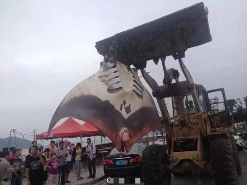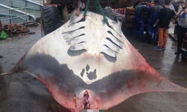 (ĐSPL) - Con cá đuối khổng lồ (hay còn gọi là cá mặt quỷ), nặng hàng trăm kilogam vừa được một người dân Trung Quốc bắt được. Ông đã phải thuê chiếc máy cần cẩu và xe tải để vận chuyển nó về.