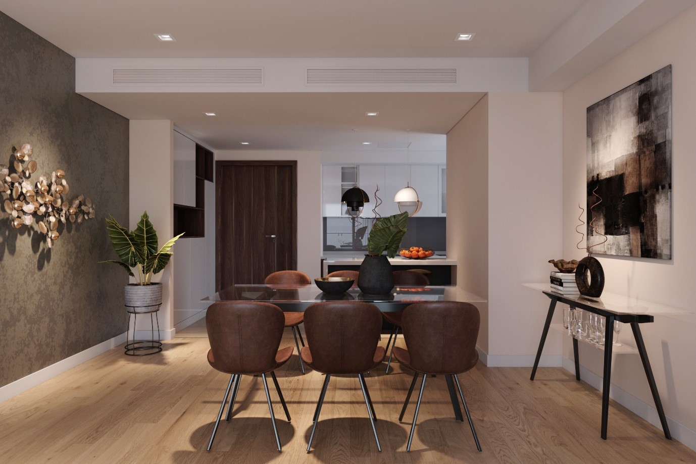 Căn 3 phòng ngủ được thiết kế theo phong cách hiện đại sang trọng luôn hướng đến việc tạo dựng không gian ấm cúng - sum vầy. Tông màu trầm không chỉ tôn vẻ hiện đại mà còn tạo không gian gần gũi, quây quần của những chủ nhân.
