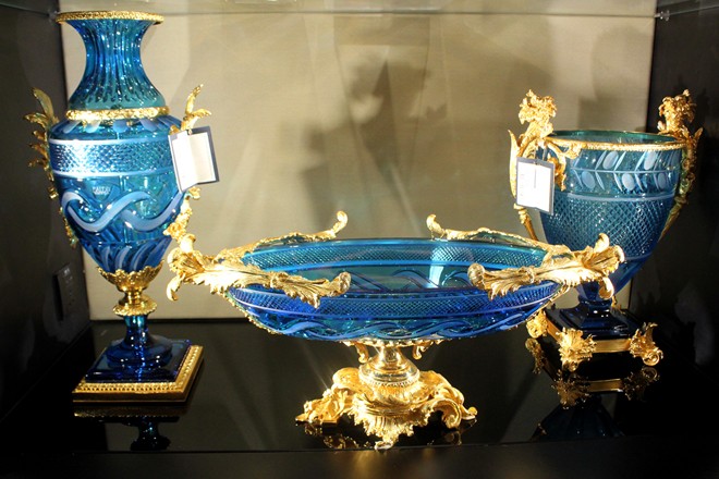 Ngoài 2 chiếc bàn nói trên, cửa hàng cũng chào bán nhiều đồ nội thất pha lê có giá trị cao. Trong ảnh là chiếc cúp pha lê khảm vàng có giá 310 triệu đồng. |