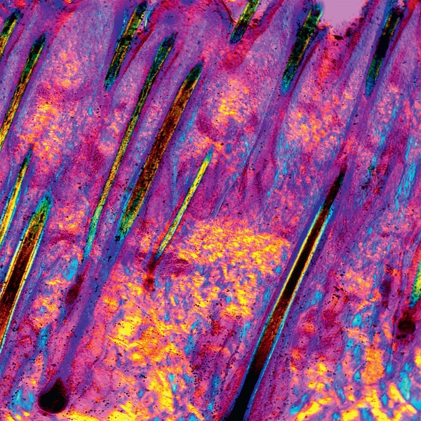 Lớp biểu bì (nửa trên của bức ảnh) bao gồm các tế bào chết không ngừng bị đẩy lên từ phía dưới. Những điểm vàng là keratin - một loại protein khiến cho da đàn hồi và không thấm nước, vì thế các cơ quan bên trong cơ thể sẽ không bị hư hại. Phần màu đen là các nang tóc.