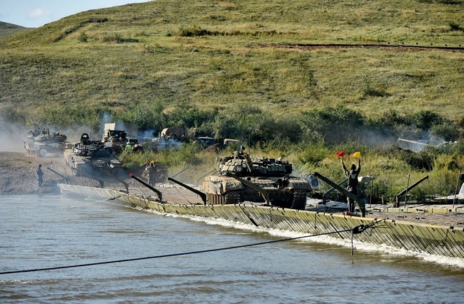 Xe tăng chiến đấu chủ lực T-72B3 lần lượt vượt sông bằng cầu phao. Do xe tăng có trọng lượng nặng nên chỉ có thể vượt sông từng chiếc một. |