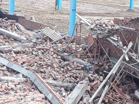 Bức tường công trình bị đổ sập hoàn toàn, gạch vữa vương vãi khắp nơi. Ảnh: Báo Vĩnh Long |