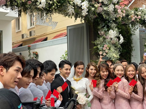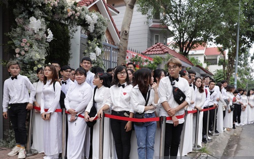 Rất nhiều fan hâm mộ đã tập trung trước nhà Đông Nhi. Các fan đều đồng loạt mặc đồ màu trắng như những phù dâu để tiễn thần tượng đi lấy chồng. |