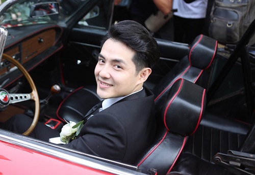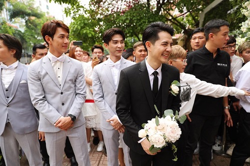 Ông Cao Thắng rạng rỡ cùng dàn phù rể trên đường đi rước Đông Nhi về dinh. |