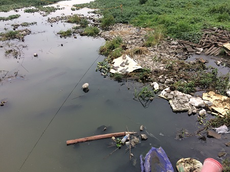 | Rác thải sinh hoạt nổi lềnh bềnh, dòng nước quanh khu vực đen ngòm, bốc mùi hôi thối |