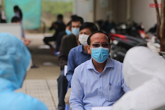 Lực lượng Công an phường xếp hàng chờ làm thủ tục xét nghiệm. |