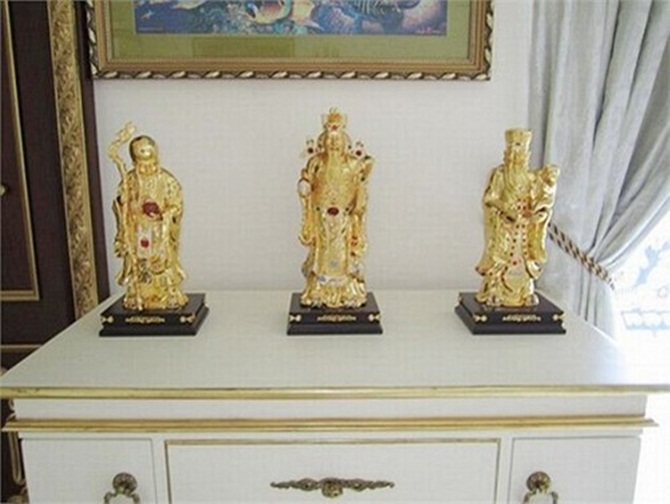 | Tượng Phúc - Lộc - Thọ bằng vàng, nạm ngọc tượng trưng cho may mắn và hạnh phúc. |