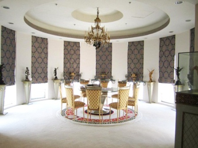 | Phòng ăn bài trí sang trọng như một khách sạn 5 sao với đèn chùm và nhiều bức điêu khắc. |