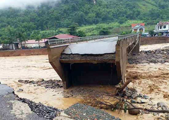 Một cây cầu ở huyện Mường La bị lũ cuốn mất phần đường dẫn. Ảnh: Báo Sơn La. |