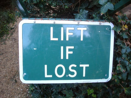 | Bảng hướng dẫn “Hãy leo lên cầu thang nếu bạn bị lạc” trong mê cung. |
