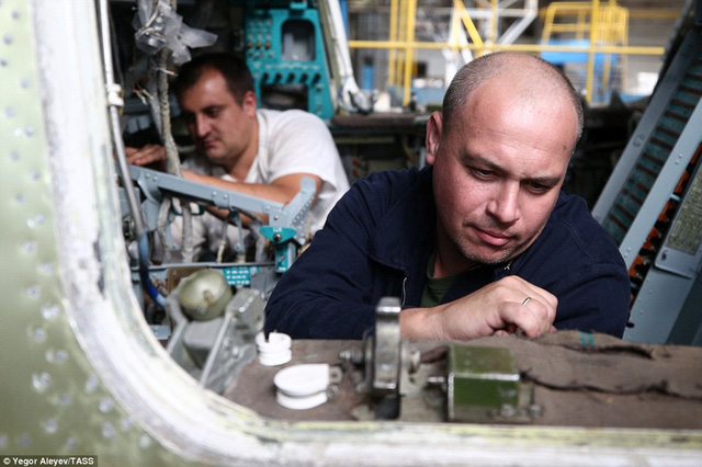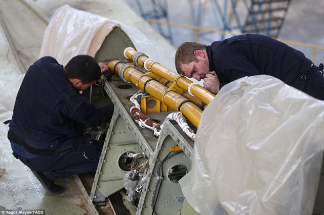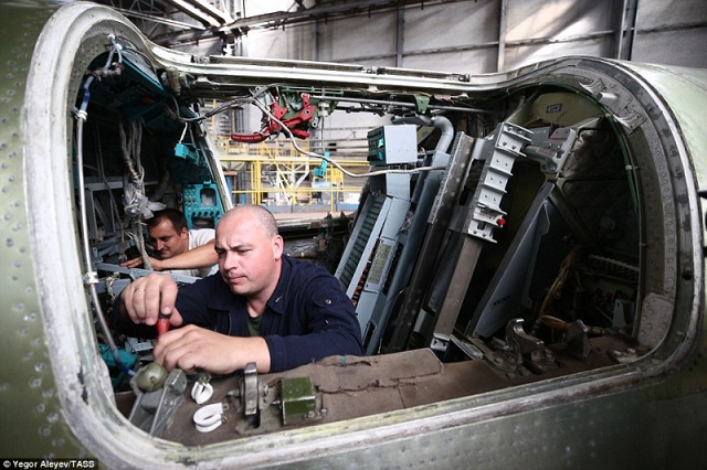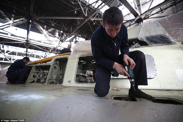 Các công nhân và kỹ sư kiểm tra tỉ mỉ quá trình lắp ráp các bộ phận trên máy bay Tu-22M3M mới. - Ảnh: TASS |