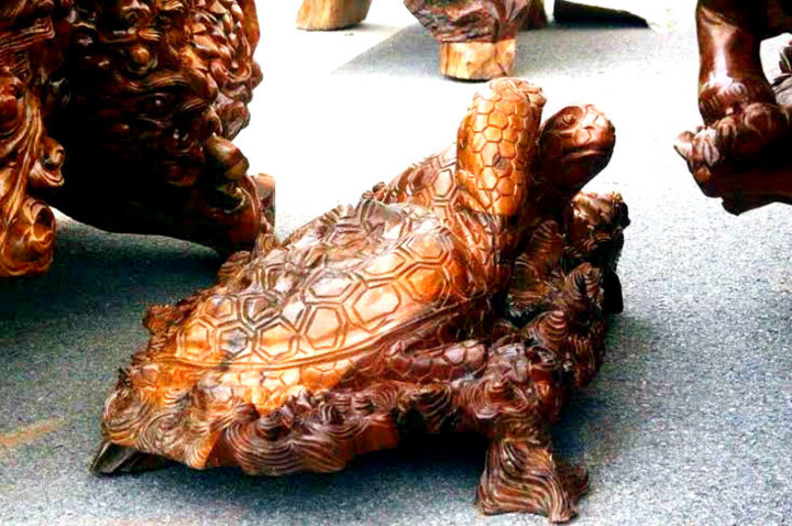Một chiếc kệ chân trạm trổ hai con rùa với đường nét tinh xảo, là “phụ kiện” đi cùng để các ông chủ kê chân lên khi ngồi trên ghế vua. Ảnh: Vietnamnet. |