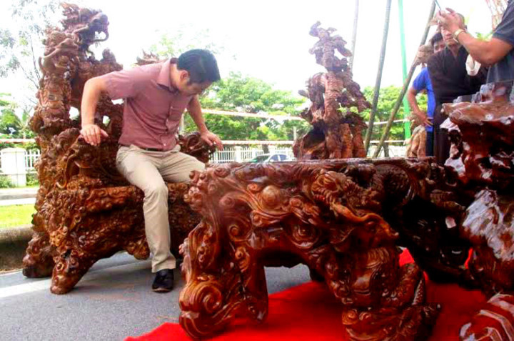 Bộ bàn ghế gỗ trắc giá 12,8 tỷ của đại gia Hà Nội gồm10 món, chạm khắc 9 con rồng - theo hình tượng và đặc điểm riêng của Rồng Việt Nam như: Rồng có bờm, râu cằm, miệng há to, răng nanh uốn ngược lên. Ảnh: Vietnamnet. |