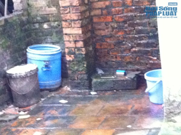 Cách chỗ phơi đồ vài mét là khu vệ sinh, rửa đồ ẩm mốc. Tường đã mọc rêu xanh đen, bên cạnh là những xô rác hòa nước mưa tỏa ra mùi hôi nồng nặc, khó chịu.