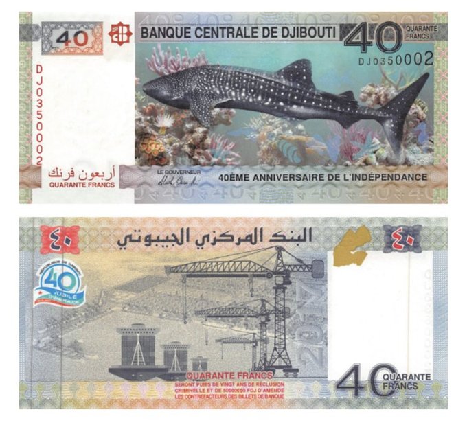 Djibouti là một quốc gia nhỏ bé tại châu Phi với dân số dưới một triệu người. Tuy nhiên, tờ 40 franc mới phát hành của nước này lại vào top 6 tờ tiền đẹp nhất năm qua. Một mặt tờ tiền in hình loài cá mập voi quý hiếm đang bơi trong rạn san hô. Mặt còn lại là hình ảnh cảng biển, một ngành phát đạt tại đây, nhờ nằm nay tuyến hàng hải quan trọng. Tờ tiền có giá trị tương đương 0,2 USD. |