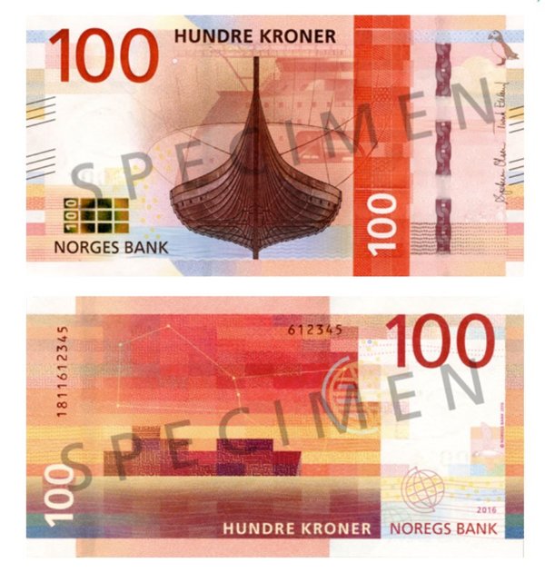 Tờ tiền 100 kroner mới của Na Uy (giá trị tương đương 13 USD) tôn vinh ngành hàng hải của nước này. Một mặt của tờ tiền là hình ảnh thuyền Gokstad - con thuyền viking lớn nhất còn được bảo tồn. Mặt còn lại là hình một con tàu container, nhằm nhấn mạnh vận tải hàng hải là ngành kinh tế quan trọng của đất nước. |
