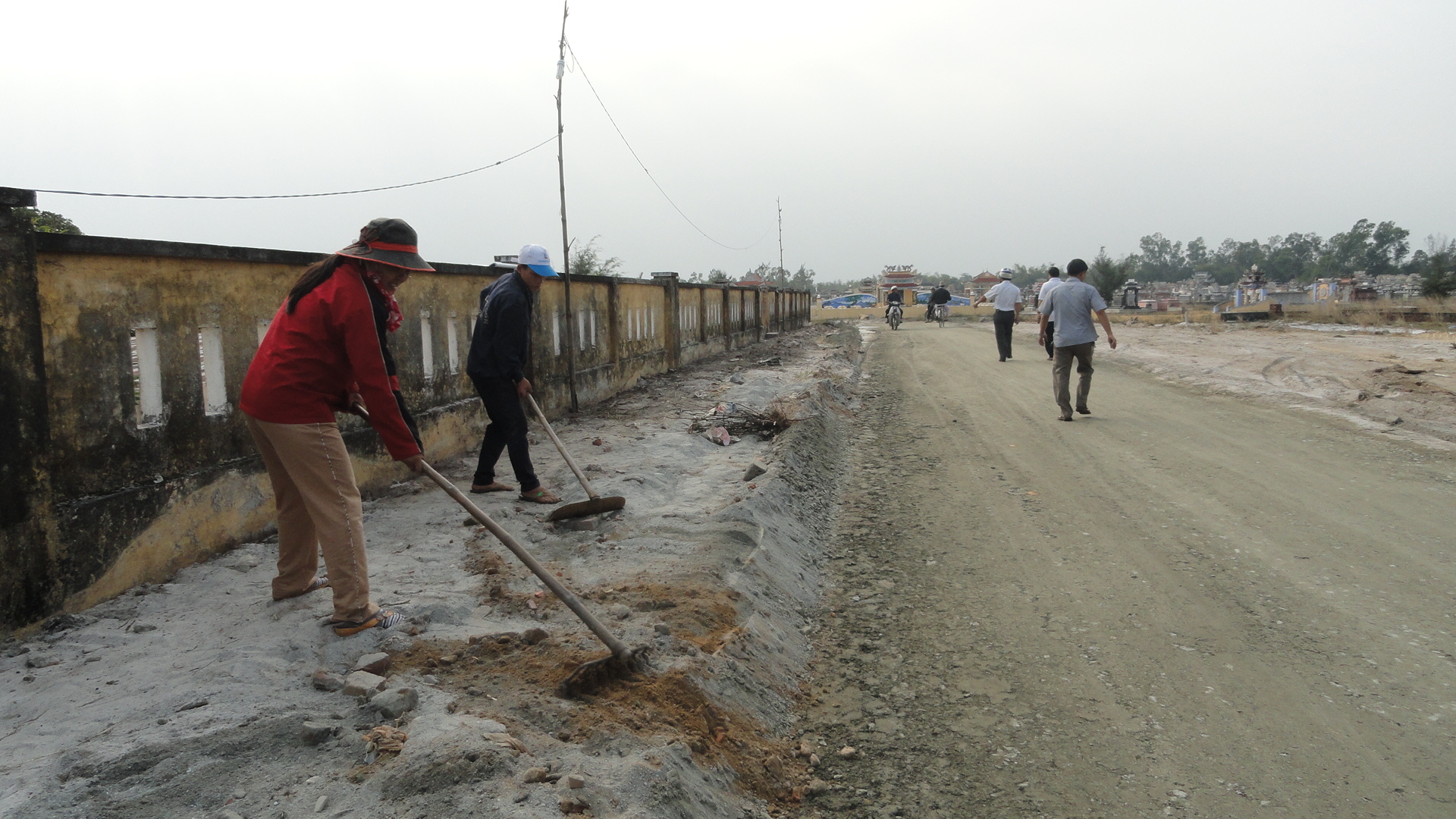 Sáng sớm ngày 14/2, việc thi công làm đường vào nghĩa trang của gia tộc họ Nguyễn Bá cũng được dân quân xã Hòa Tiến, Sở xXy dựng TP Đà Nẵng triển khai một cách gấp rút. Hàng chục xe cơ giới phục vụ cho việc san lấp mặt bằng được huy động đến hiện trường.
