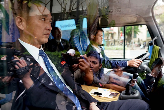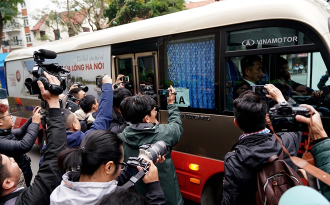 Phóng viên trong nước và quốc tế bao vây đoàn xe an ninh và báo chí Triều Tiên khi vừa về tới khách sạn Melia. Ảnh: Zing.vn |