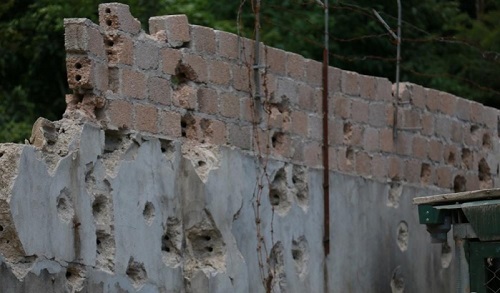 Tường rào bao quanh toàn bộ căn nhà của ông trùm ma tuý lỗ chỗ những vết đạn xuyên thủng sau cuộc đấu súng với lực lượng cảnh sát.