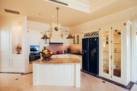 Phòng bếp có gam màu trắng chủ đạo, được trang bị tiện nghi, ấm cúng. |