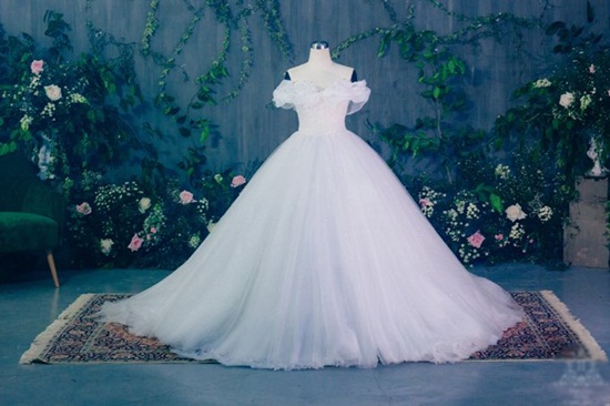 Phần thân trên của váy cưới được ôm sát, tùng váy xòe rộng, bay bổng và được thêu đính công phu tỉ mỉ. |