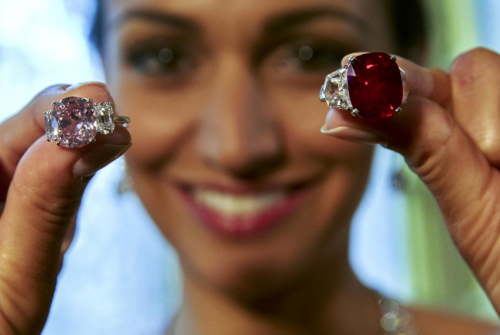 Viên “Ruby mặt trời mọc” (phải) và viên "kim cương hồng lịch sử" |