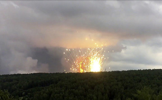 Những hình ảnh được ghi lại cho thấy một khối lửa khổng lồ cuộn bốc trên trời, khi kho đạn quân đội ở vùng Krasnoyarsk, miền trung nước Nga phát nổ.