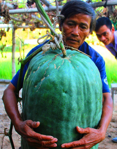 Nông dân làng Bàu Chánh Trạch 1 và Chánh Trạch 2 (xã Mỹ Thọ) nổi tiếng cả nước vì trồng được giống bí đao “khổng lồ” có trọng lượng trung bình 60kg/ quả, có quả nặng gần 100kg. Ảnh: Dân việt |