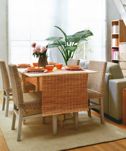 Giáp lưng sofa phòng khách là bàn ăn theo phong cách đồng quê mộc mạc, gần gũi. Nội thất chất liệu mây tre tự nhiên mang đến hơi thở của không gian đồng nội thanh mát, nhẹ nhàng, đặc biệt là sự xuất hiện của tấm mành tre thân thuộc được sử dụng làm khăn trải. Bình hoa hồng phớt và chậu cậy xanh là chi tiết trang trí cảm xúc, đồng thời góp phần tăng thêm sức sống thiên nhiên đang tràn ngập.