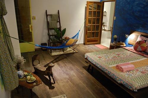 Kế tiếp là không gian phòng ngủ chính, vừa rộng rãi vừa thoáng mát. Điểm nhấn của căn phòng là chiếc giường theo kiểu sập cổ xưa cùng bộ chăn, ga trải giường thường dùng trong những ngày thời bao cấp. Bên cạnh còn điểm xuyết chiếc võng nhỏ độc đáo.