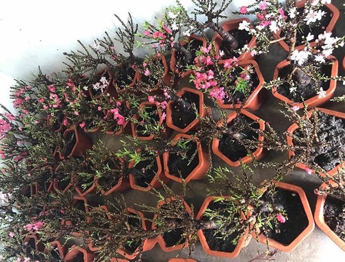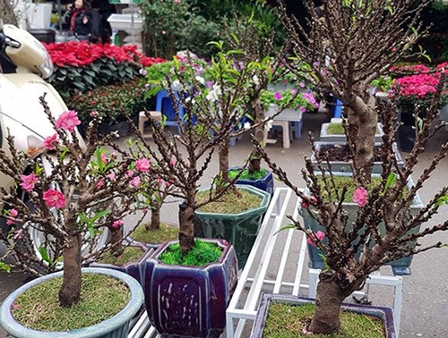 Những chậu đào mini được bán với giá gấp hơn 10 giá gốc nhập từ Trung Quốc. |