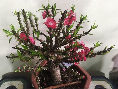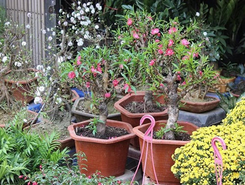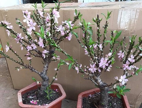 Những chậu đào này chỉ cao khoảng 30-40cm, hoa có màu hồng phớt khá đẹp mắt, nhiều nụ trắng ở trên cành, thân cây chỉ bằng cổ tay hoặc nửa cổ tay rất nhỏ gọn, phù hợp bày biện trên bàn tiếp khách, ban công, cầu thang,... cho gia đình ngày Tết.