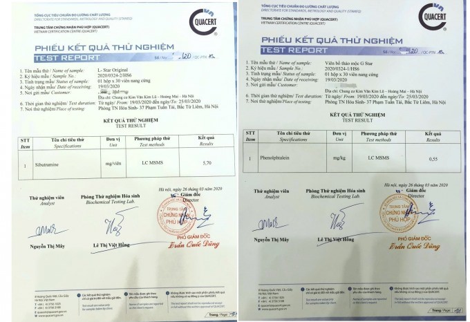 Tài liệu phóng viên có được cho thấy, thông tin từ Kết quả kiểm nghiệm của Trung tâm Chứng nhận phù hợp (Quacert) đối với viên bổ thảo mộc G-Star phát hiện có hàm lượng chất Phenolphthalein; còn trong viên uống giảm cân L-Star Original chứa chất Sibutramine.