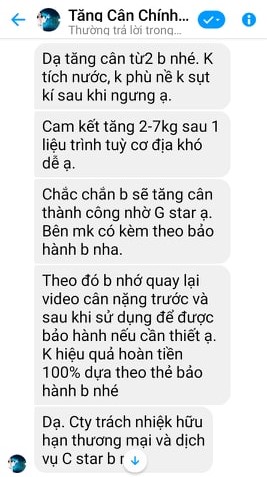Liện hệ với số điện thoại tự nhận là một đại lý phân phối của Công ty TNHH Thương mại & Dịch vụ C Star đối với dòng sản phẩm Viên bổ thảo mộc G-Star, phóng viên được người này liên tục khẳng định về tác dụng tăng cân “thần kỳ” của sản phẩm: “Sản phẩm bảo hành trong một tháng. Người khó thì có thể 2 tuần bắt đầu tăng cân, người dễ thì sẽ tăng cân được ngay”.