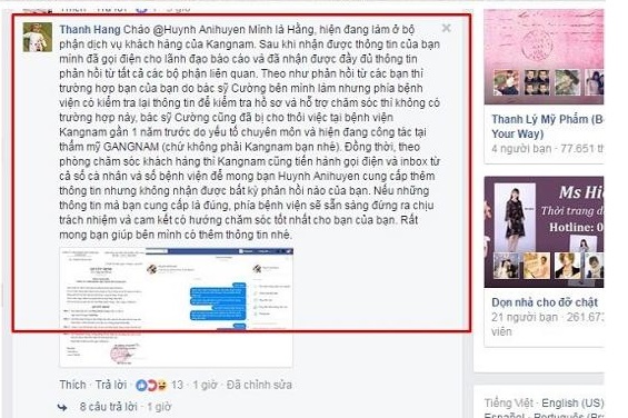 | Phía đại diện BVTM Kangnam đã có đính chính công khai với khách hàng. |